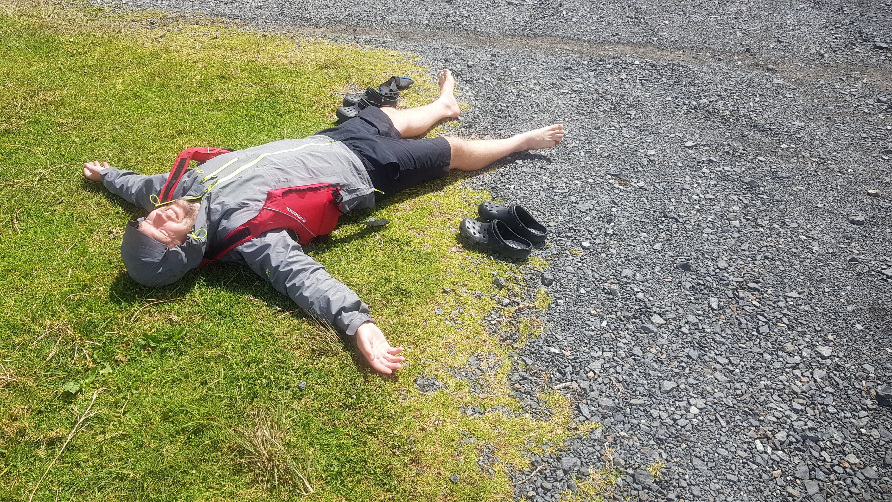 With significant cloud cover and a strong breeze I was chilled to the core, trying to absorb every inch of sun I could. Very chivalrous of him, Adam changed into his hiking shirt and gave me his jumper. I took of my wet pants, put on my rain skirt and by the time Dan arrived I was semi defrosted but dressed like a bag lady. We exchanged Dan our packs for his kayaks, put some fuel in our bellies and bid Dan farewell.