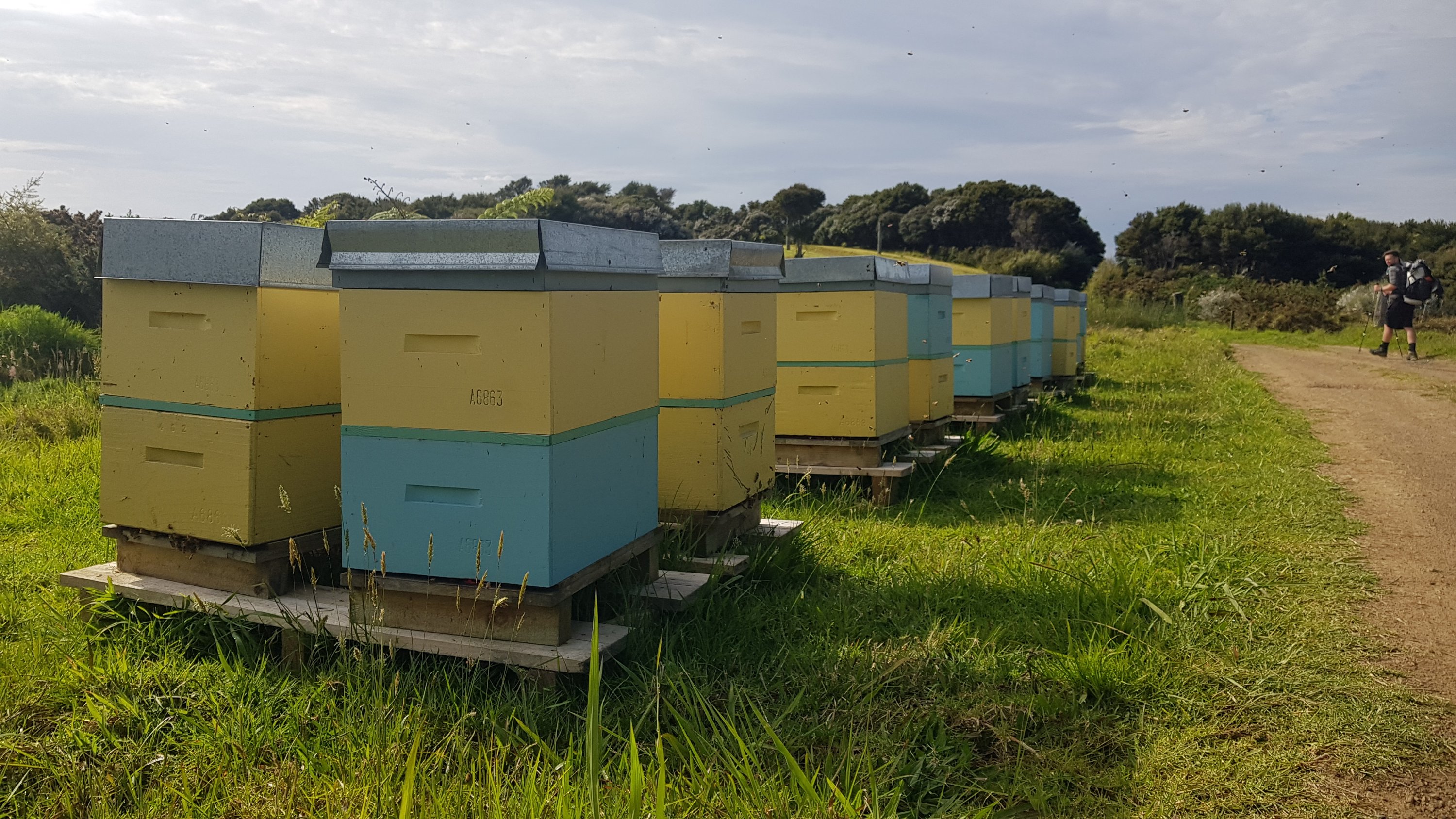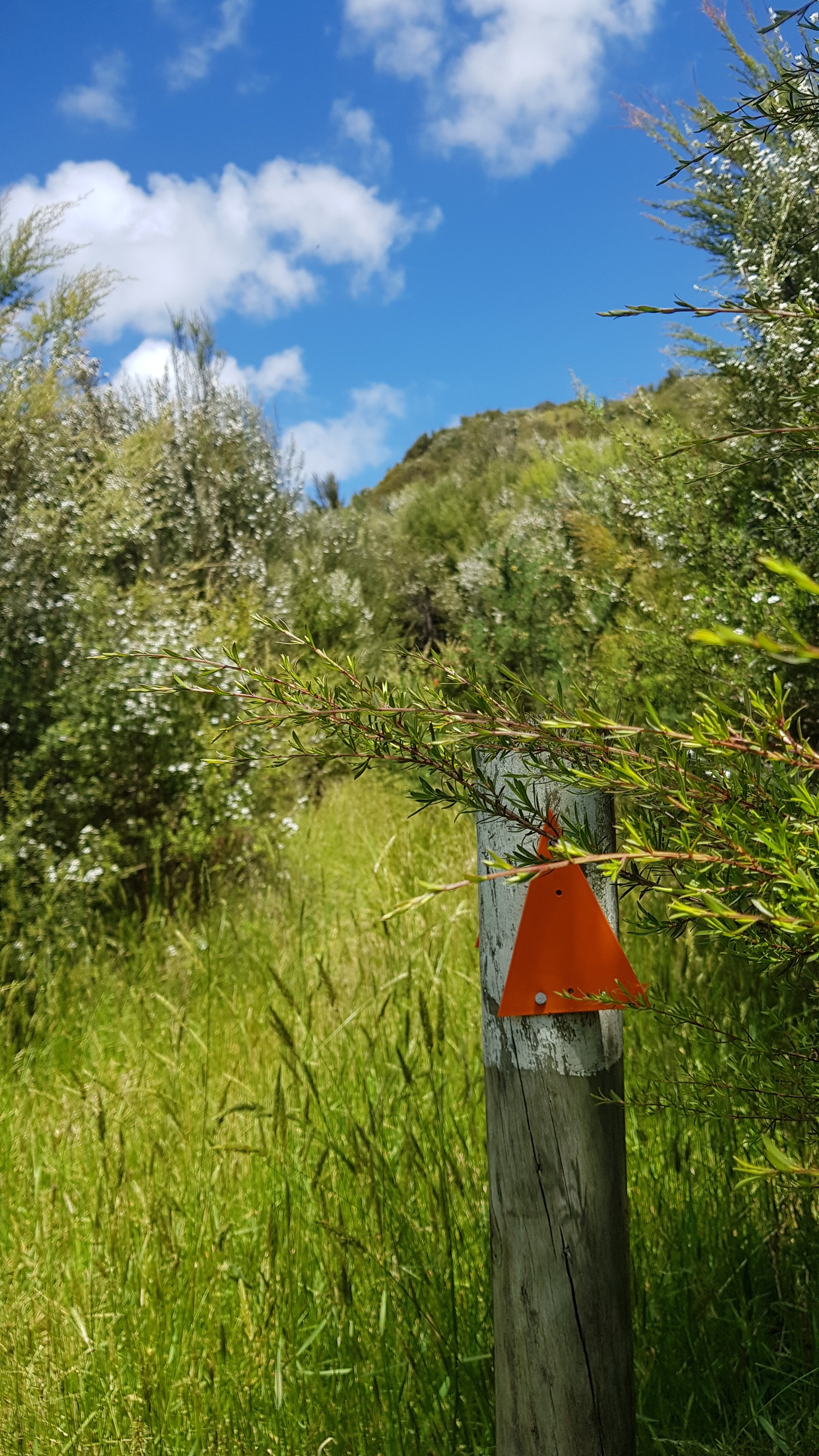 We continued though regenerated manuka forest teaming with honey bees fast at work. The trail climbed up and down continuously. It was fairly slow going and required thoughtful navigating to stay on track.