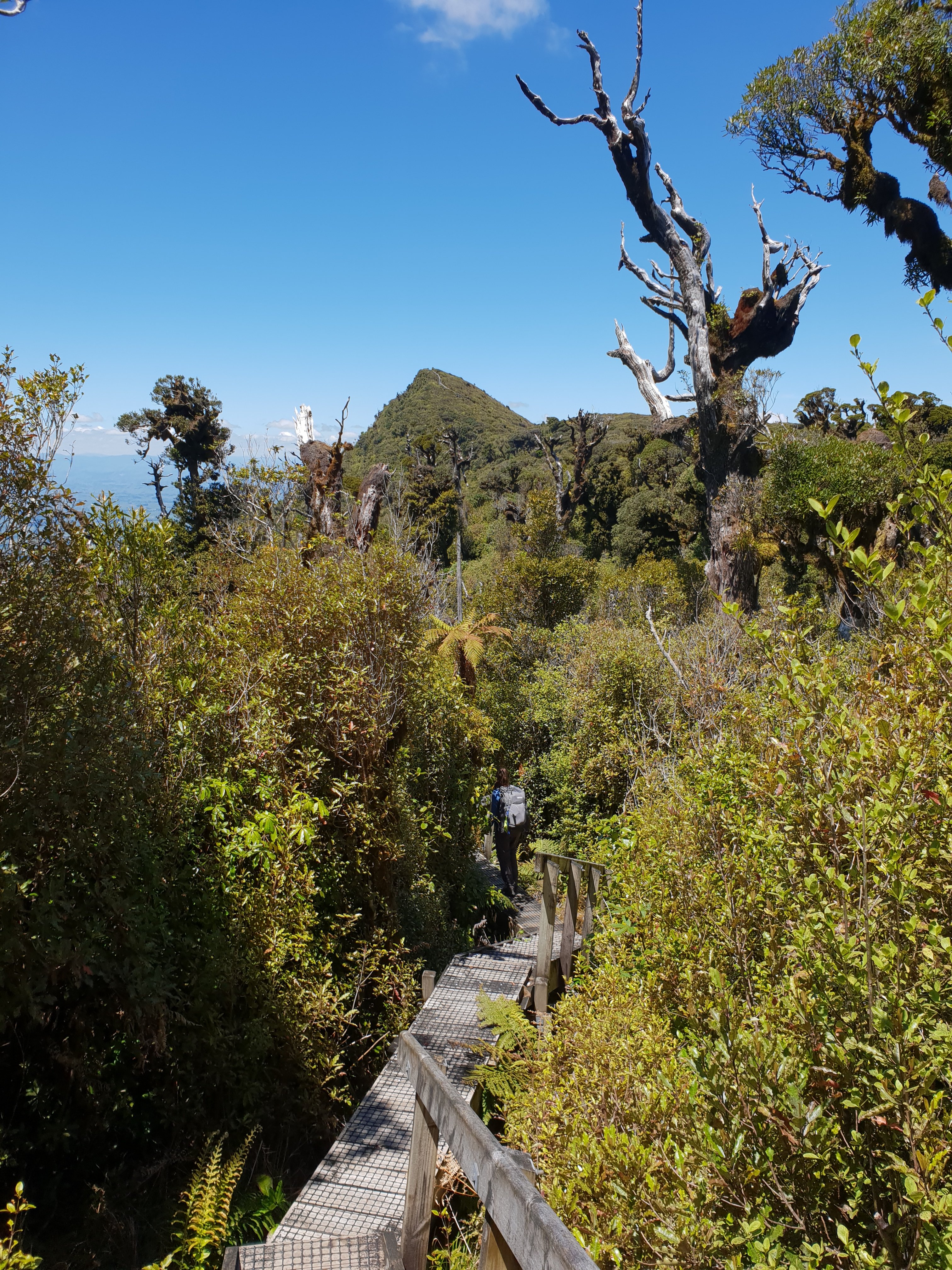 From Pahautea Hut the Hihikiwi track dropped down quite suddenly by way of a thoughtfully constructed boardwalk and stair case. It then forces you to climb up again to the summit of Hihikiwi where the beautiful boardwalk abruptly ends, ejecting you onto what the kiwis term ‘tramping track’.