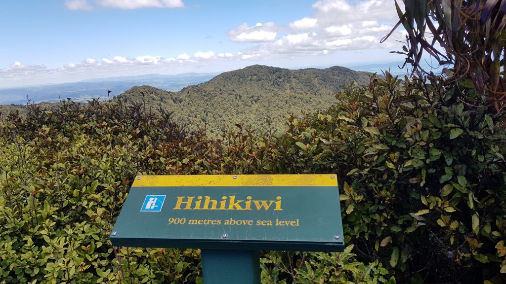 We had a snack break at a view point overlooking the valley below us with a windfarm in the distance. From there it wouldn’t be too much further to the summit of Pirongia. The last 1.5km were the most challenging section of the climb, the track became quite muddy in parts with no option but to plow straight through. There was some scrambling up the steep slopes before we were ejected onto a beautiful boardwalk which would lead us to the summit. We felt incredibly lucky to have brilliant sunny blue skys and magnificent views from the 959m summit.