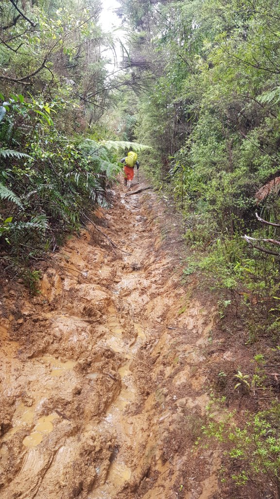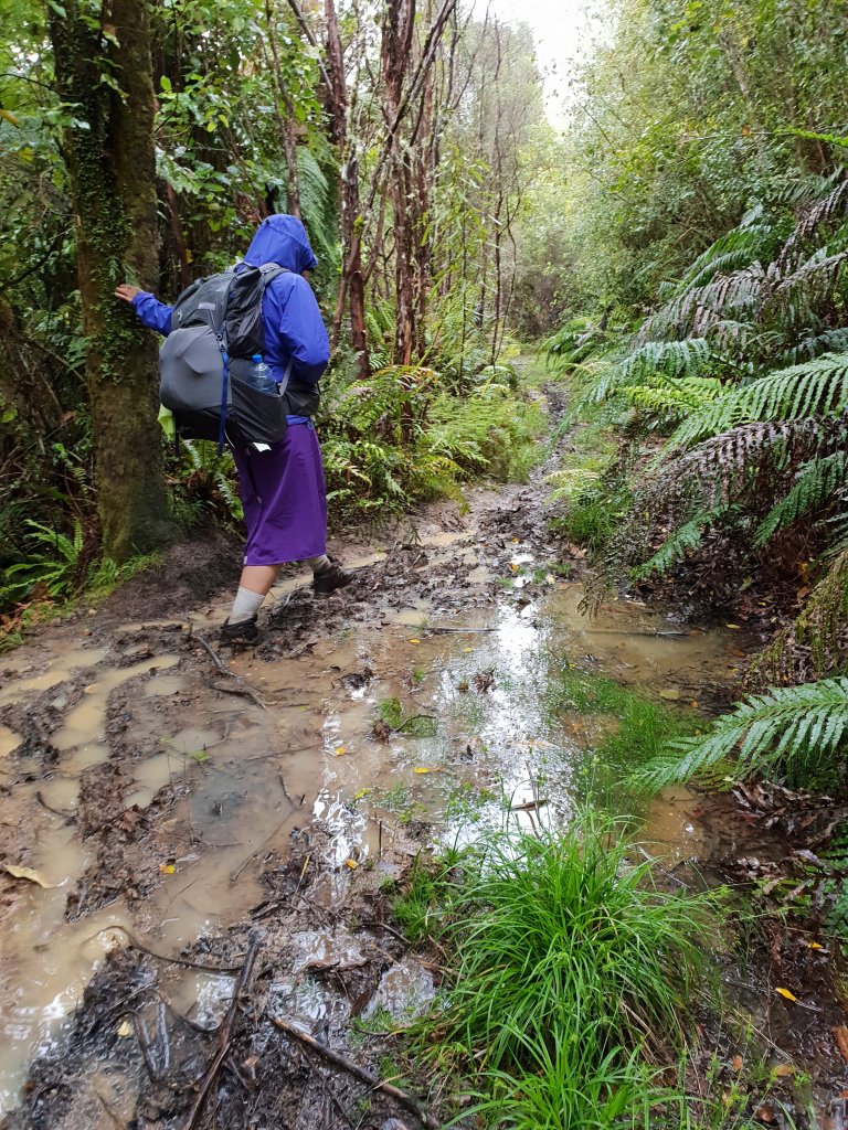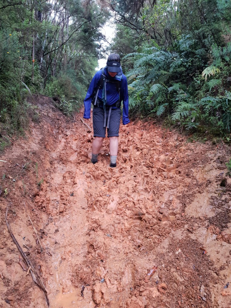 With the thought of hunters fresh in our mind it wasn’t long until we hit the turn off to a beautiful forest track. It looked magical with low hanging cloud in the trees above us. We still had 13km to go at this point. The weather was still pretty poor and I was too cold to stop for lunch so I shovelled food in my mouth as we walked. I was hoping the trail would give us a little reprieve and the grade would improve allowing us to pick up the pace. It wasnt to be, the forest floor was clay covered in leaf litter. Perfect conditions for a slip and slide, as Adam discovered. As he proded his way downhill with his hiking sticks, his feet slide out from under him. It was as if I was watching a cartoon. His body made an arc through the air as his feet went up and his bum went down. He slid down the slope on his back. I could do nothing but laugh (After checking that he was ok of course). It was a hard fall. Audible. His trashbag rain skirt had proved itself in this situation. It had protected most of his beige pants from the thick black mud. The same can not be said for his pack, the bottom of which will never be the same again.