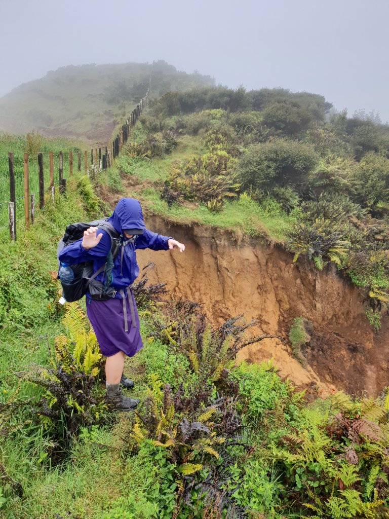 The bush track to Waitomo was soft and unsteady underfoot, overgrown with ferns so you couldn’t see what you were stepping on. I was walking with my hands in my pockets trying to defrost them. This meant I had less balance and fell over twice on this section of trail alone. At one point Adam and I tripped in quick succession on the same jutted point in the path. I went down first, face into the ferns. The contents of my packs pockets went sprawling down the hill and I was pinned down by the weight of my pack. Adam came down behind me, pole first, straight into my upper thigh. It was a comedy of errors. After this I could do nothing but laugh. Another 50m down the track we came to a large landslide. I couldn’t believe it, what else could go wrong today? We detoured around the gaping big hole in the earth, the soil spongy underfoot. I wanted nothing more than to be out of that crater. I had the heebie jeebies and could imagine the earth we were standing on falling away too.