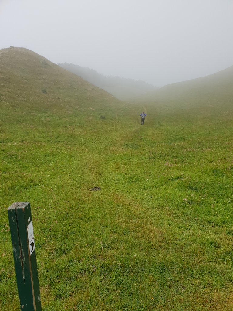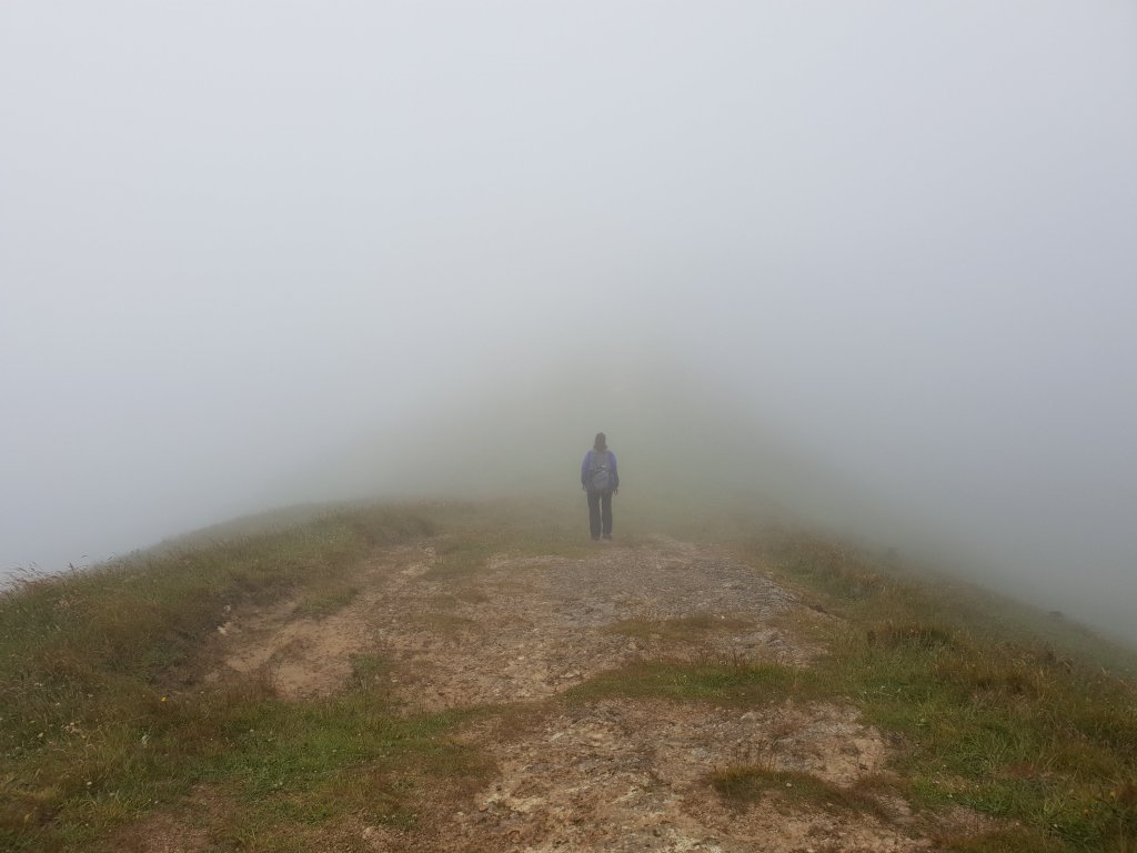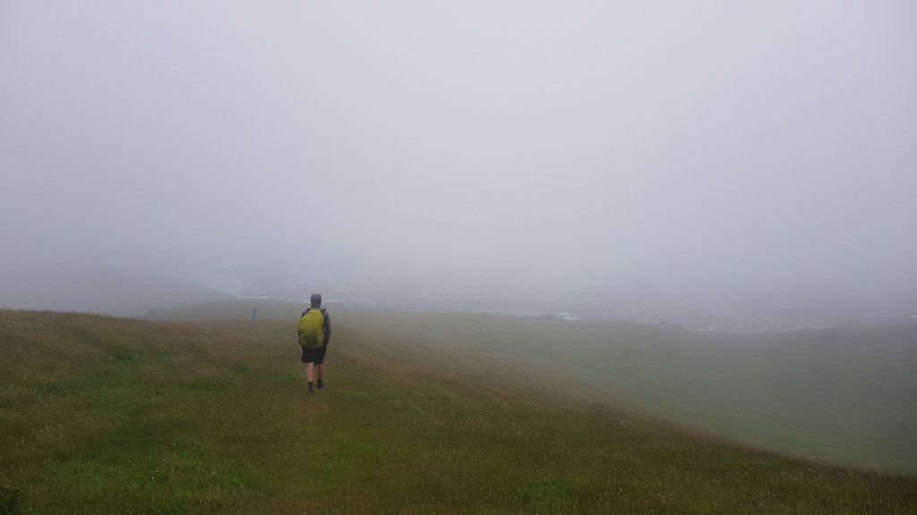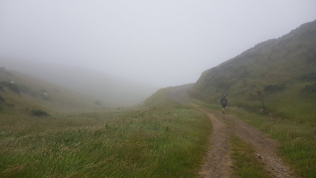 Walking across the tops of hills in heavy cloud, we were having flashbacks to our walk into Waitomo. Only this time, with Leigh’s waterproof jacket having been recently washed, it seemed to be doing a much better job at keeping her dry so she wasn’t as concerned about the risk of hypothermia.