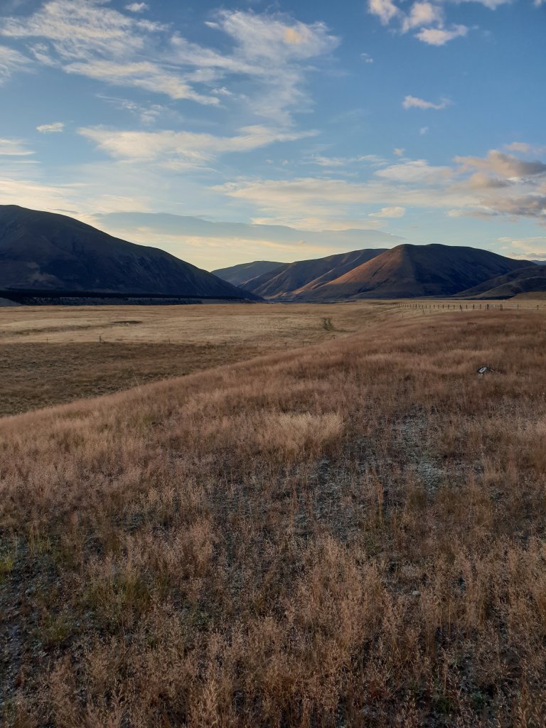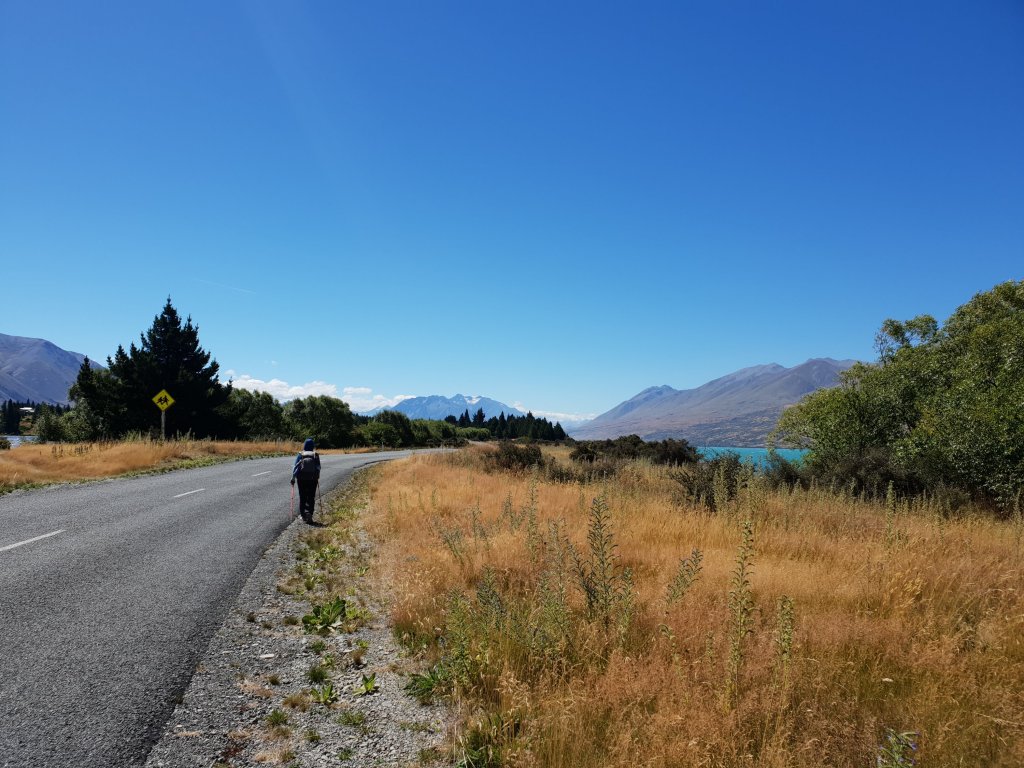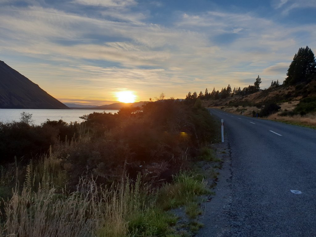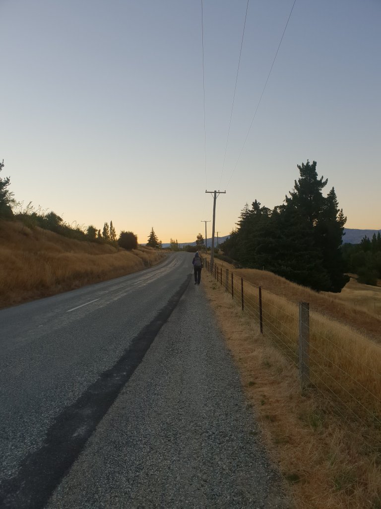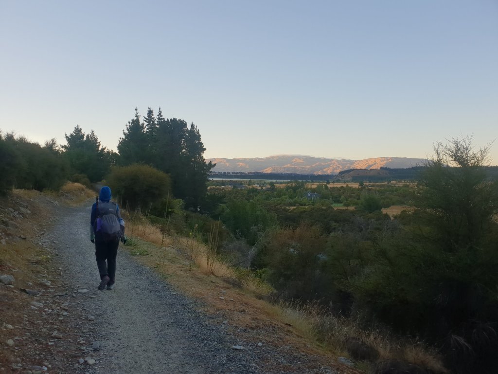 For the first time in a few days we managed to get up early and leave our campsite as the sun was rising. Despite being on the road shoulder again at times, I really enjoyed the morning walking, as we were regularly granted views of the sun rising over Lake Ohau.