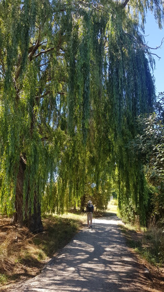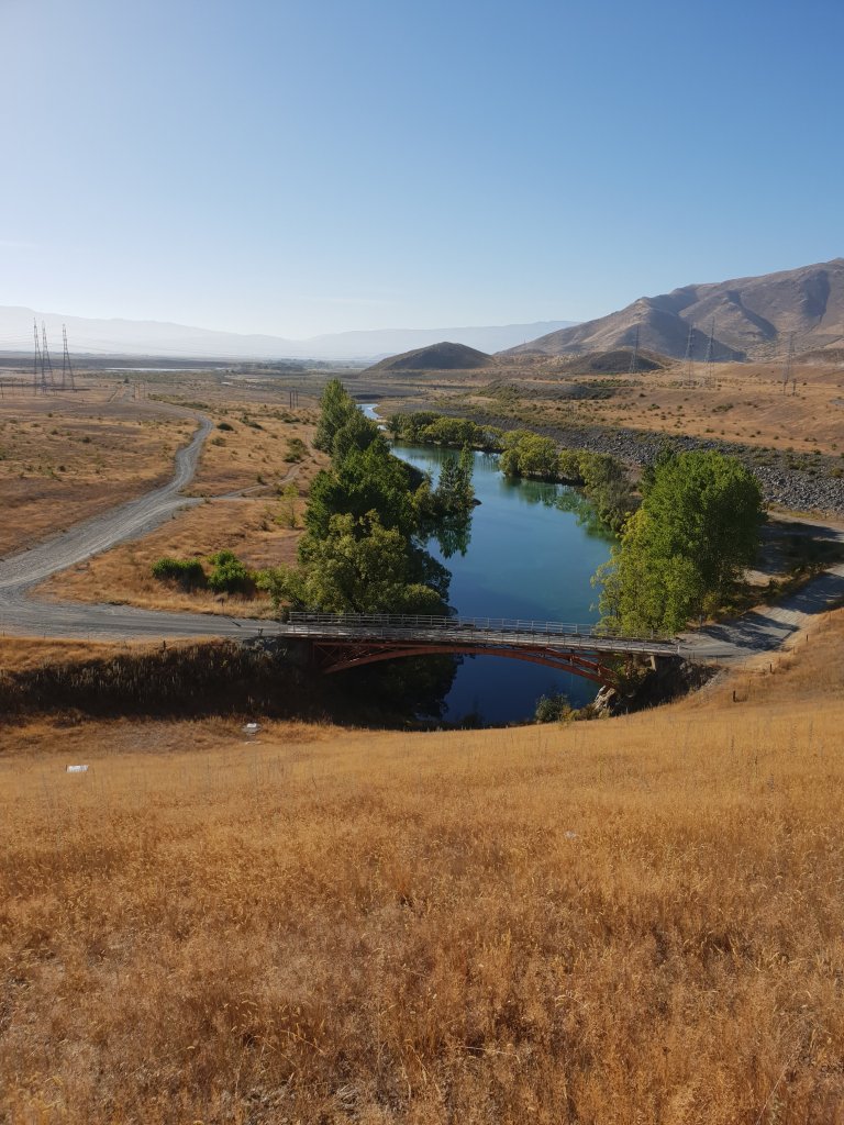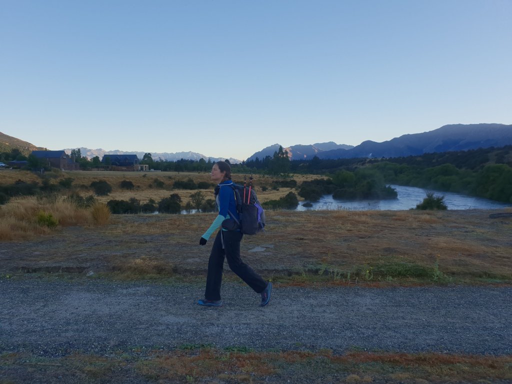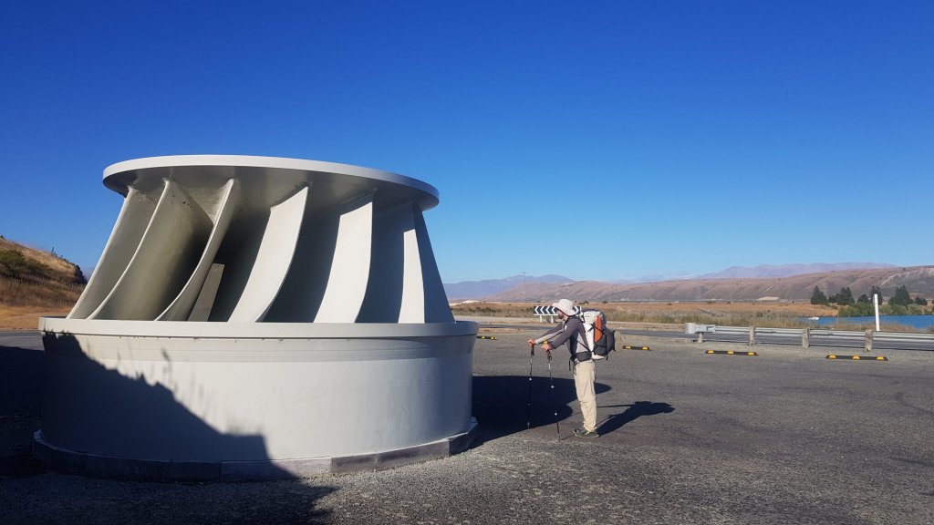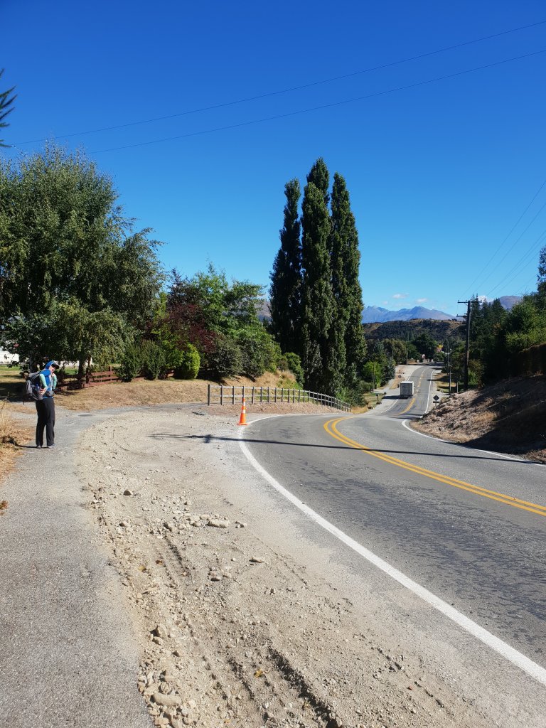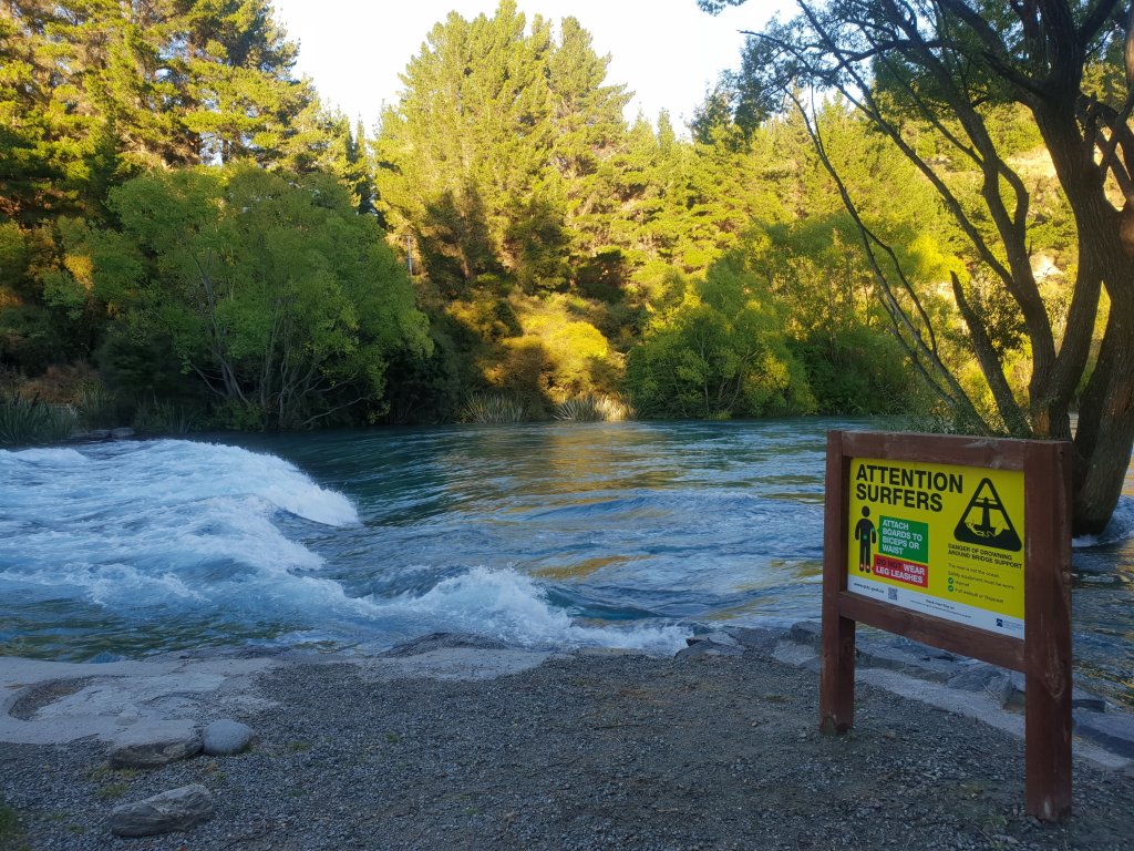 Once we were finally up and moving later in the morning, we started walking along the gravel track towards Albert Town. Following the Hawea River, the track was much nicer than expected. We stopped briefly to admire a whitewater park on the river – a standing wave that had been constructed for use by paddlers and surfers.
