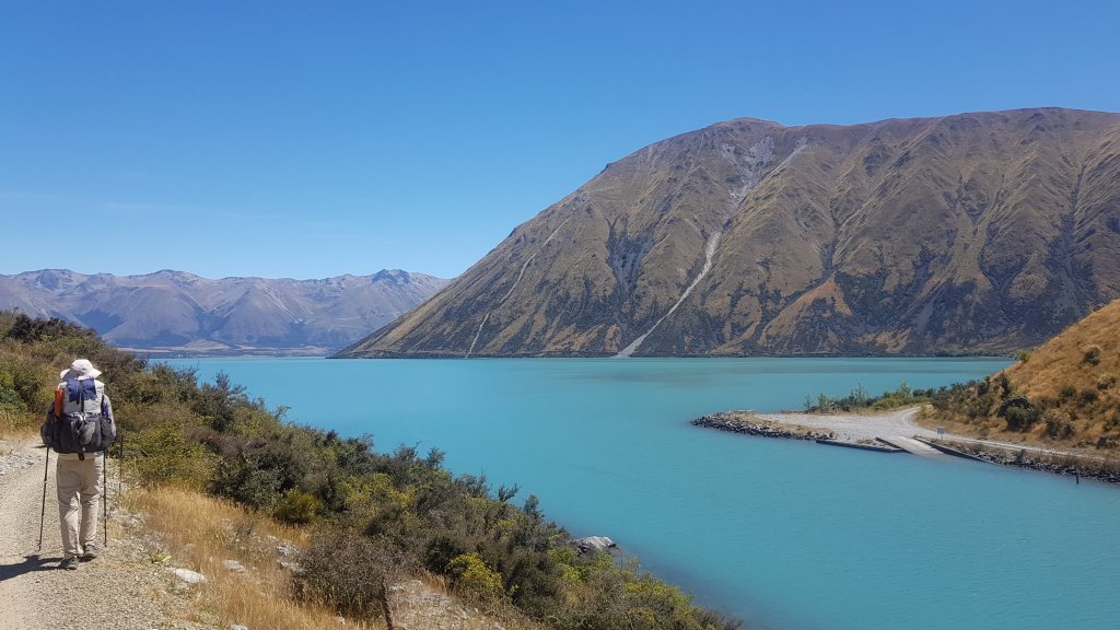 Eating lunch in the scorching sun, we didn’t hang around too long before continuing towards the Lake Ohau campsite. Once we reached the shores of the lake, we felt the temperature drop immediately as the lakeside breeze brought some much needed relief. The flat gravel cycle track surrounding the lake made for some easy walking too, which helped motivate us for the last 10km to the campsite.
