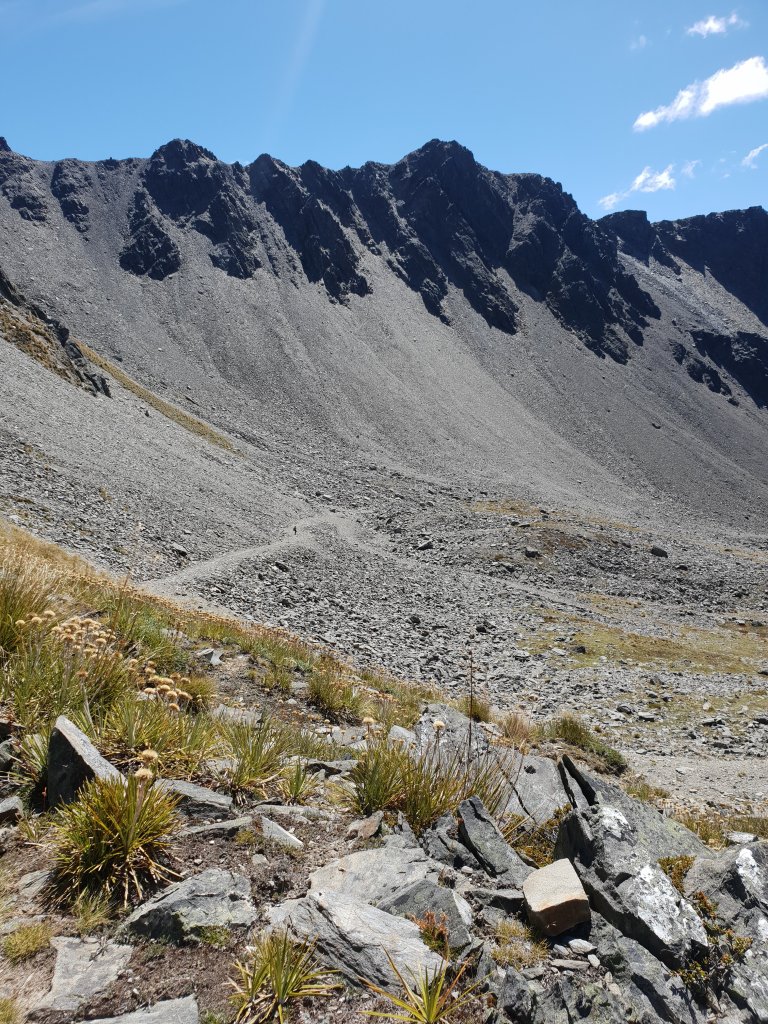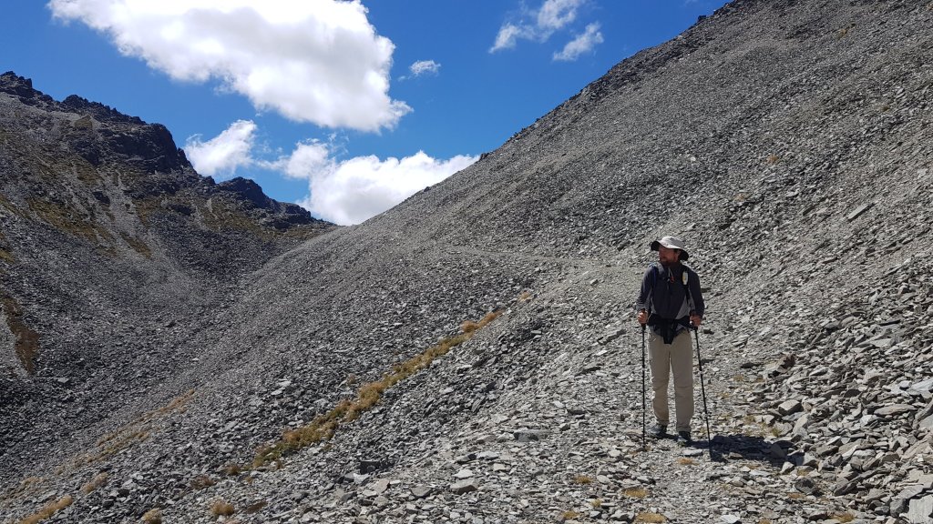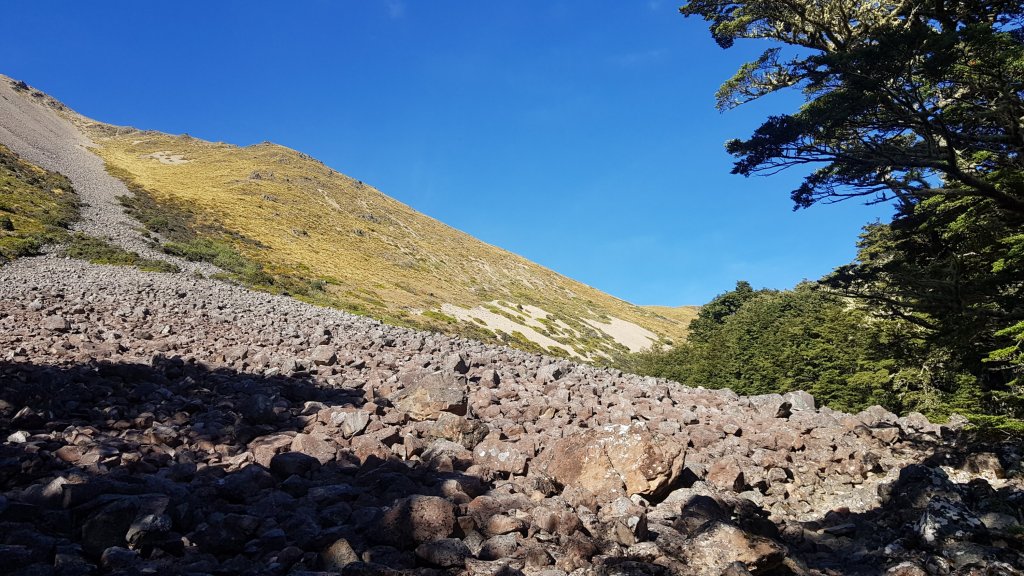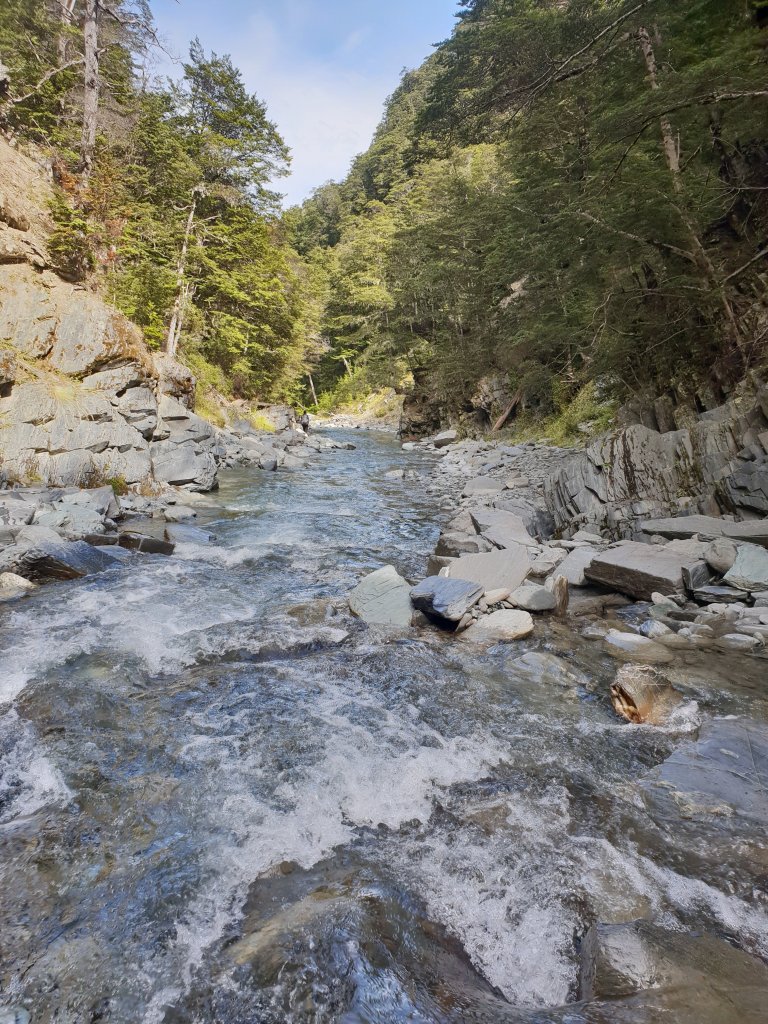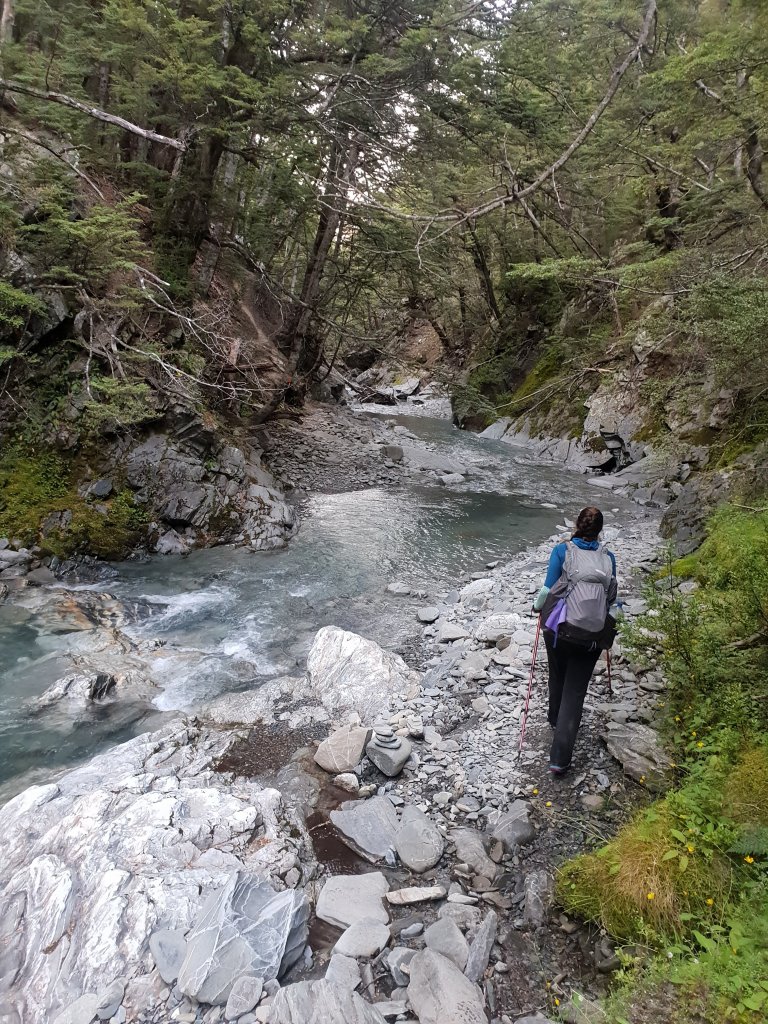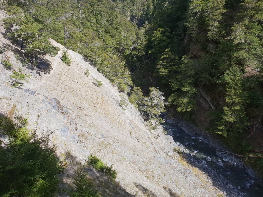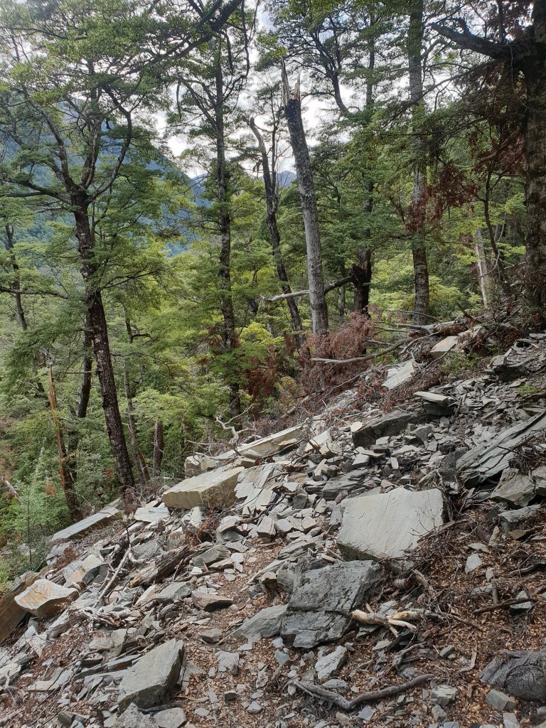 The morning walking had us travelling parallel to the river through the forest, but mostly a lot of frustrating up and down in the process, with some slippery track to boot. The track had also been damaged in parts by rockfalls, which made for some challenging walking.
