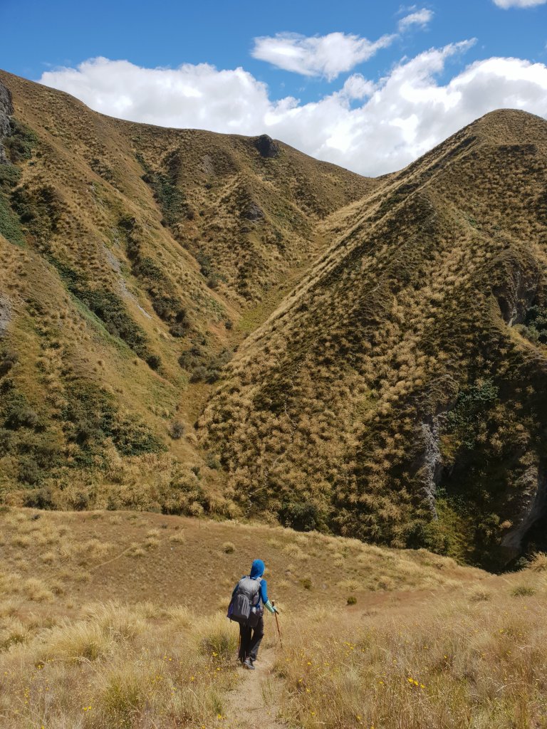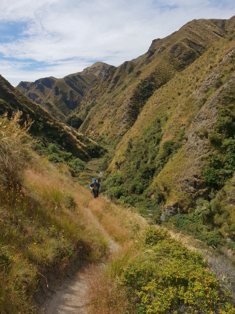 Looking out from Highland Creek Hut we could see the trail heading steeply up the spur of the mountain in front of us. Out onto the trail we headed down into the valley before quickly heading up the steep trail. We had two big climbs and two big descents to get to Roses Hut.