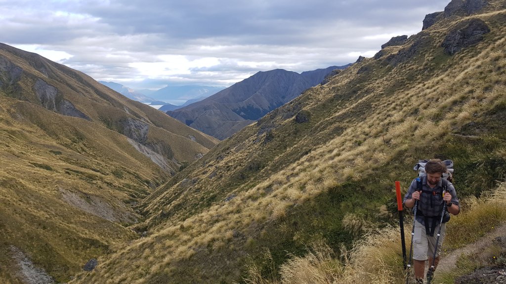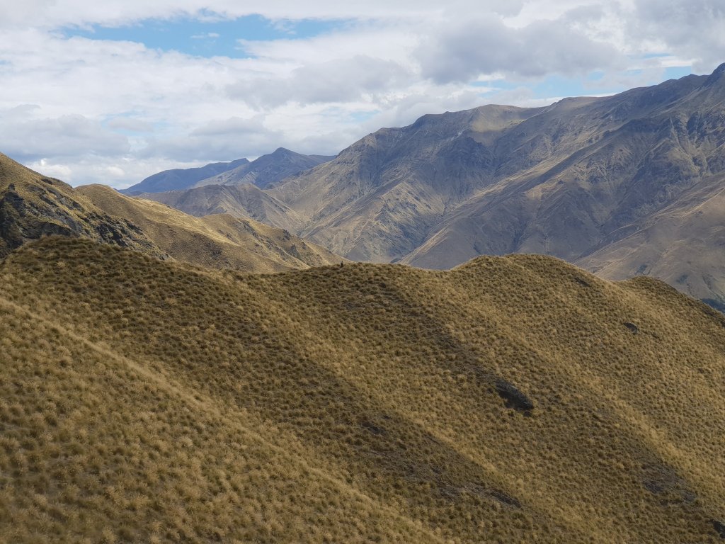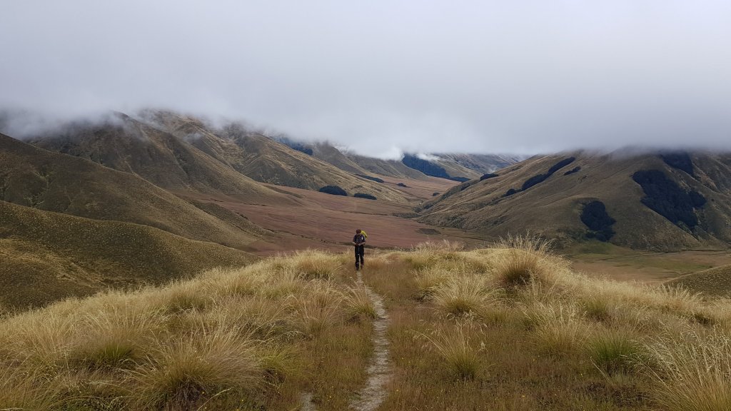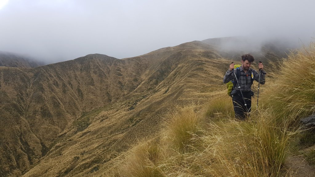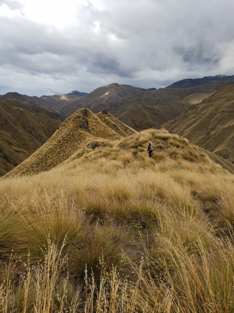 Reaching the high point of the trail we traversed along the ridgeline, taking in terrific views of the mountains all around us, covered in beautiful golden tussock. As we walked the clouds and rain started to close in and the wind picked up. We had been lucky to avoid the rain all day so we were waiting for it to catch up with us.