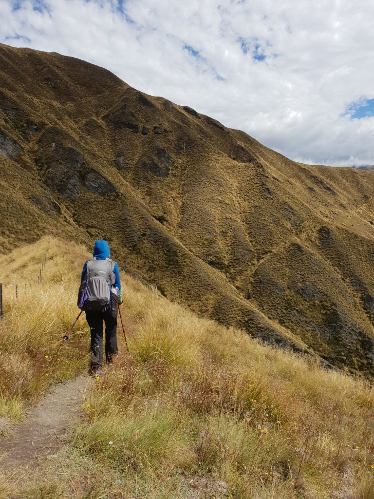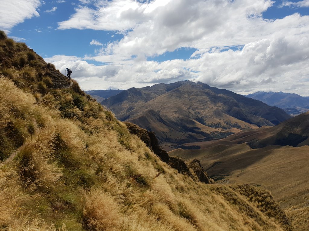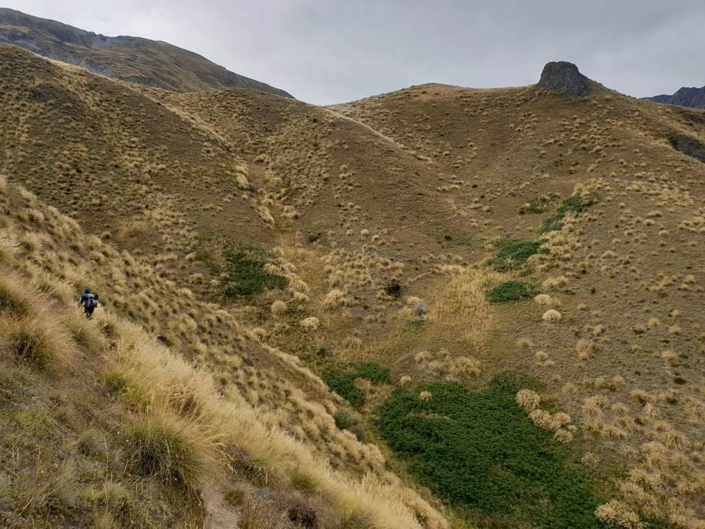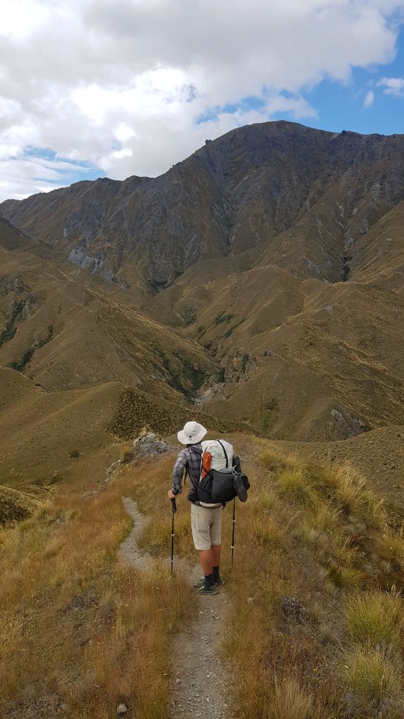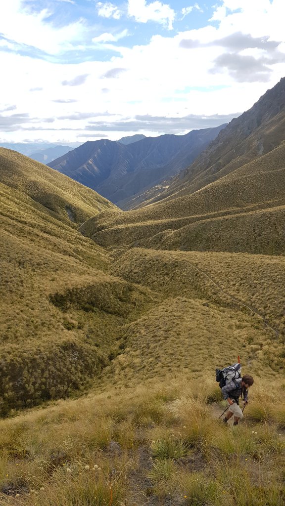 Reaching the high point of the trail we traversed along the ridgeline, taking in terrific views of the mountains all around us, covered in beautiful golden tussock. As we walked the clouds and rain started to close in and the wind picked up. We had been lucky to avoid the rain all day so we were waiting for it to catch up with us.