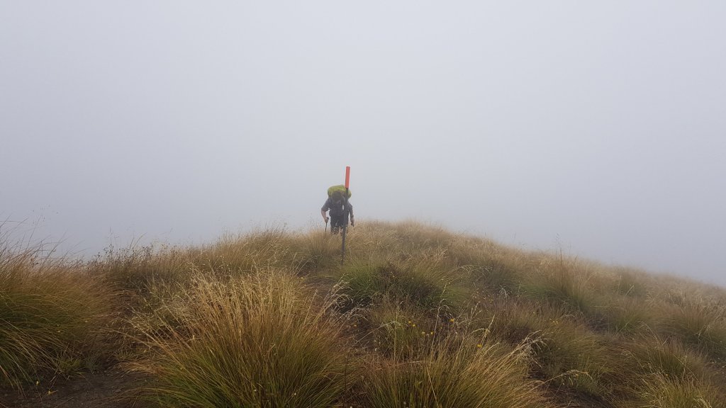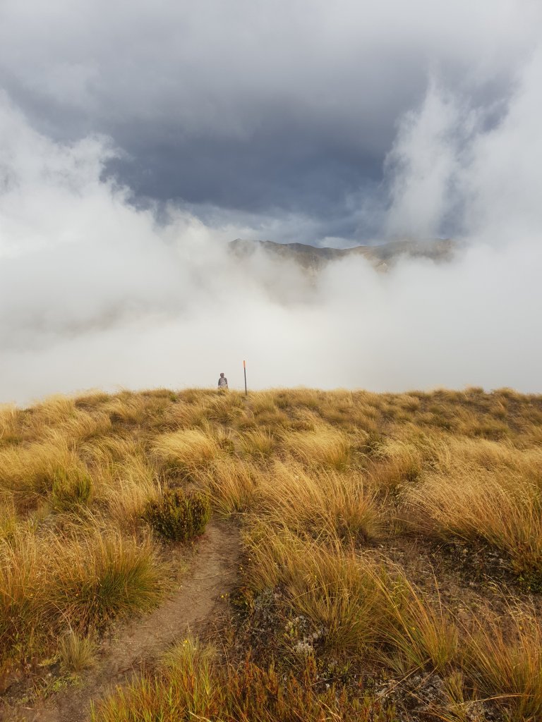 As soon as we left the hut the trail had us climbing up to Roses saddle, 1270m above sea level. It was a long slow climb to the top. Thick cloud had settled over the valley so it wasn’t far into the ascent when we had climbed into the cloud. It obscured our views but I think it made the climb quicker and possibly a little easier. We couldn’t see how far we had come and how far we had to go or how high we were, all we could do was climb.