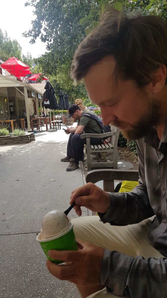 I was super excited when we popped straight out of the river and into the main street of town. The best part was, the trail basically entered town right on the doorstep of the ice cream shop. With 30 minutes to spare we had sweet cold indulgence in our hands. Phoebe and Netty hadn’t lied. It was the most delicious ice cream I have eaten since arriving in NZ. I will go far as to say it comes a pretty close second to my all time favorite ice cream, Serendipity (although i’ll probably have to try a couple more scoops to be able to verify that). Not only was the flavor incredible but the scoops were super generous too. I was in heaven. The best part, they also have a store in Queenstown!