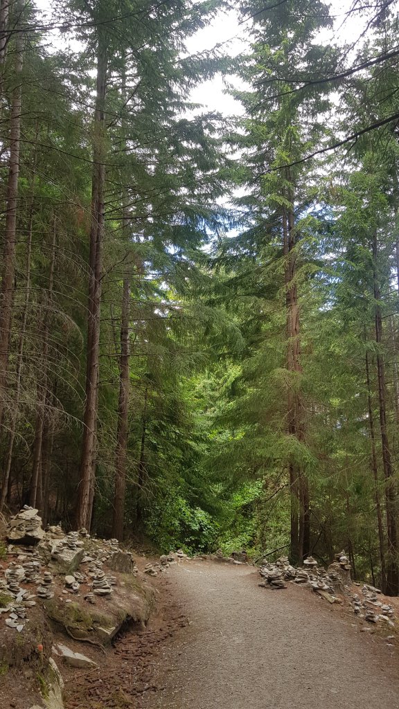 Our walk up to skyview level (the top of the gondola) was underneath a canopy of trees, first pine and then beech. Occasionally we had views out over the water. It was a steady climb, every so often we would come across the handywork of a talented arborist. There were mushrooms, chairs and all sorts of artworks carved into tree stumps along the way up.
