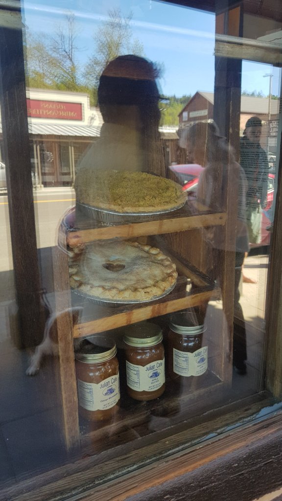 It was a 12 mile windy drive to Julian with spectacular views to some the mountain ranges we had been walking through over the last week. We chatted to the angels who had picked us up and they briefed us on the town. Julian is a small tourist town whose main street is 600 feet in length. It has a couple of cafes, supermarket and not one, not two but three pie shops. One of which offers a free slice of pie to PCT hikers! I was amazed beyond belief, free pie for all of the dirty, sweaty hikers who walk into town.