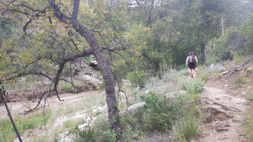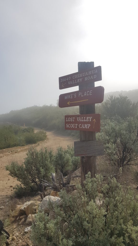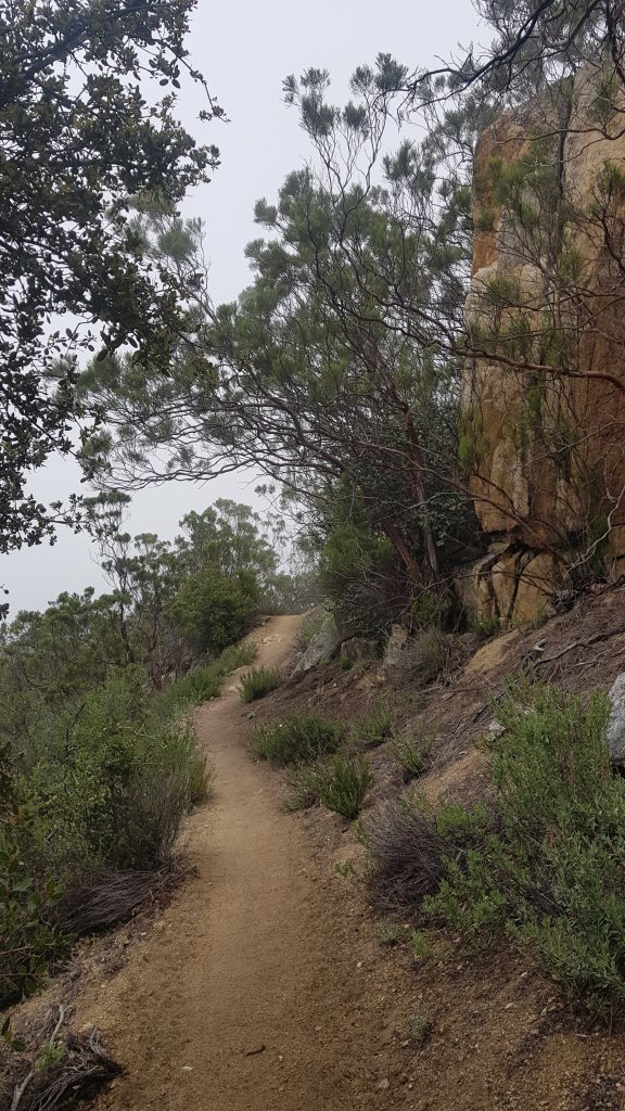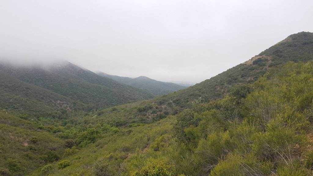 We would be gaining around 2,000 feet in elevation during the day but the switch backs made the climbing gradual gentle. The weather changed as we began our climb, the sun disappeared behind clouds and all of my views were obscured. I was happy to have found the connector for my ear phones during my time in Warner Springs and listened to an audio book for the afternoon. With no views to look at while I climbed and with a heavy pack filled with water for the night of dry camping ahead, I was happy for the distraction.