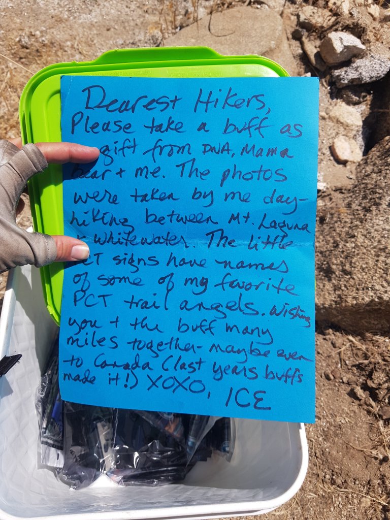 The first was a free buff personally designed by a very generous Trail Angel. It features photos that they took along their PCT hike. The buffs were sitting in a container on the side of the trail, I was a little wary of opening it at first but was glad when I did.