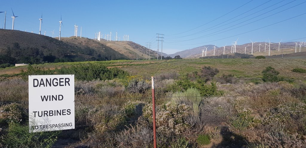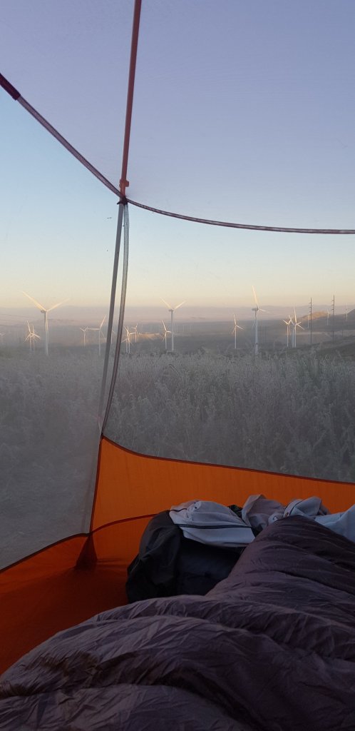 I had a short but incredibly windy 3.5 mile walk through the windfarm. I’d seen a note on guthooks about a ‘partially’ sheltered campsite behind a juniper bush beside the trail. The description was right. I found the site. It is semi sheltered but the winds are still strong so I slept without the fly. I guess strong winds should be expected when trying to camp in a windfarm.