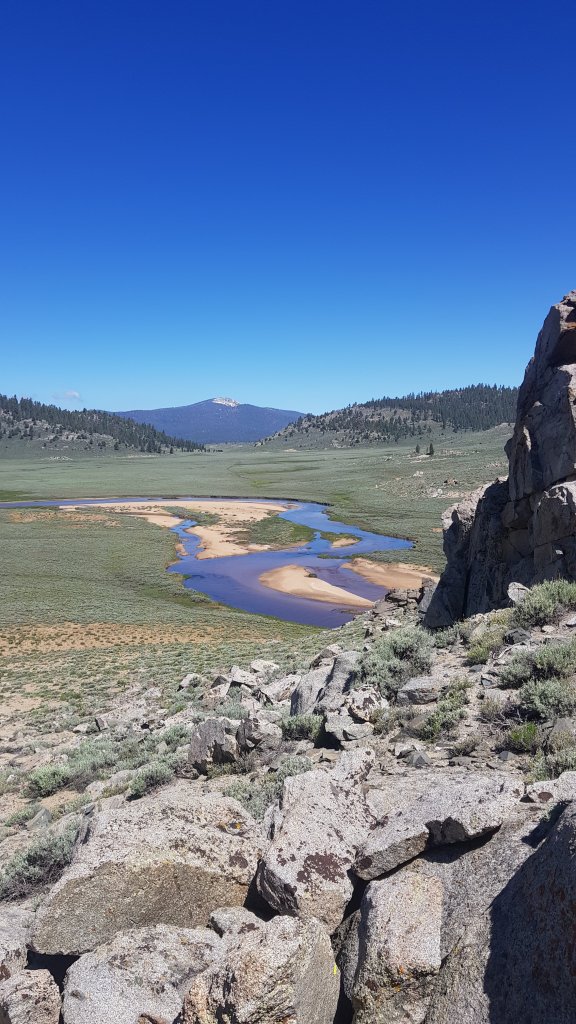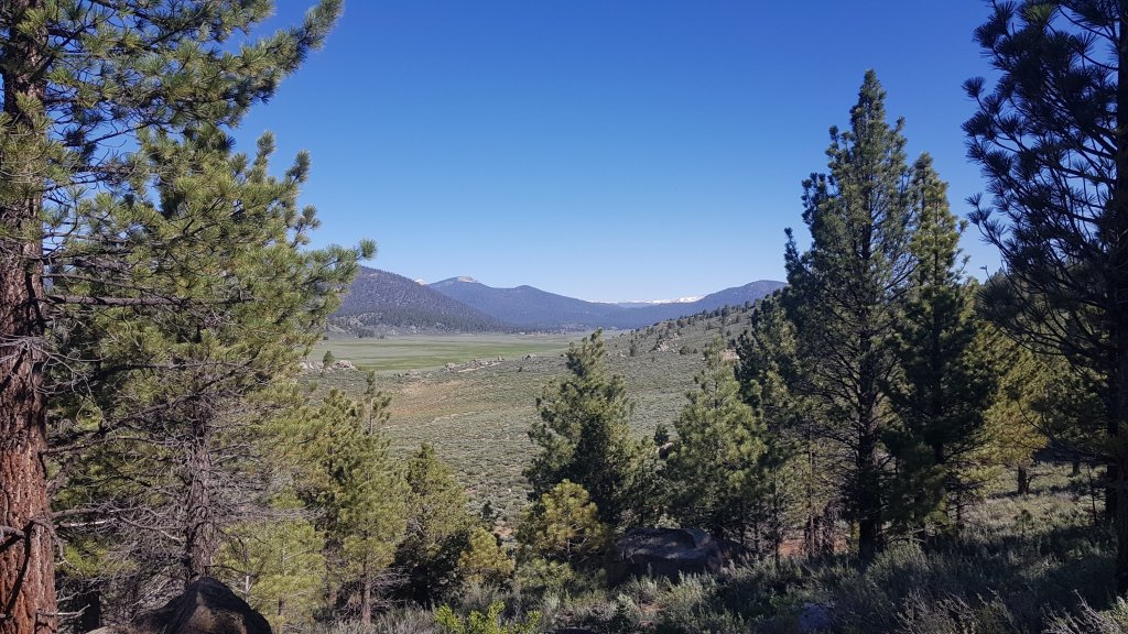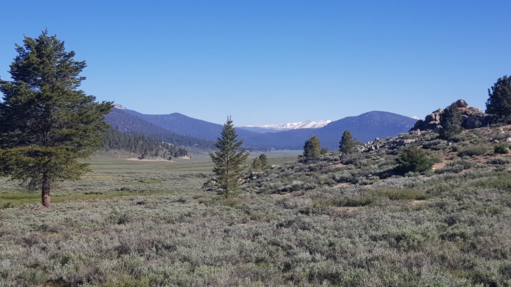 After chatting with The Fonz for a while I continued on, the pine forest opended out into a beautiful meadow. Lush grasses in the foreground and the snow capped peaks of the sierras in the distance. It was a beautiful scene.