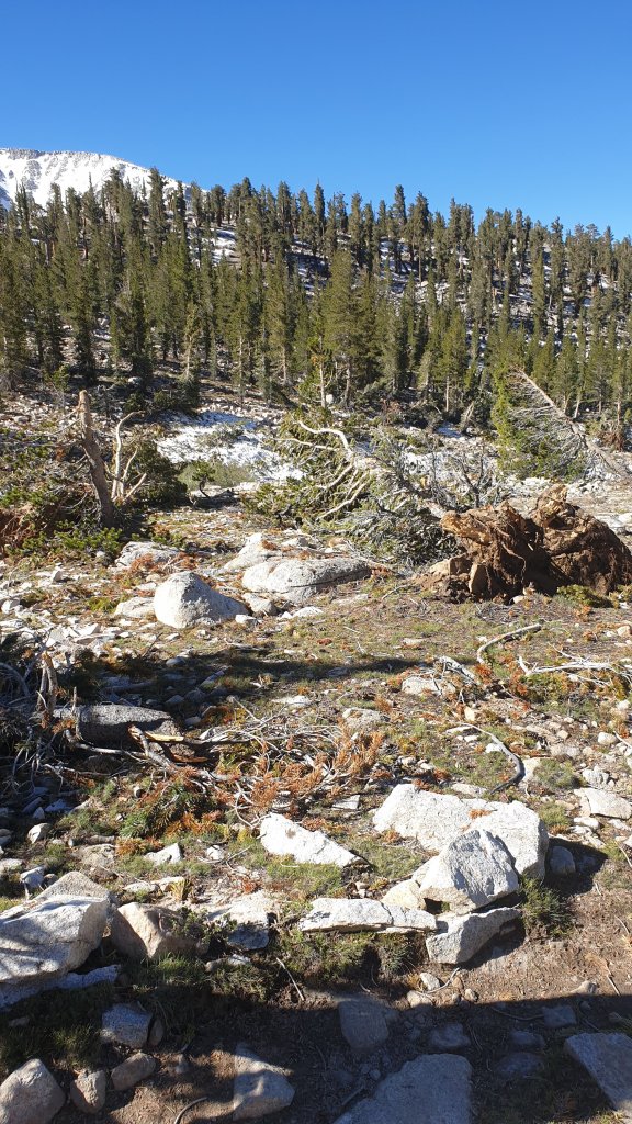 Further along the trail, we saw the sheer power of snow, which appeared to have recently destroyed and knocked down every tree in its path, probably via avalanche.