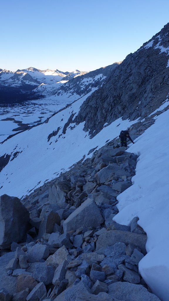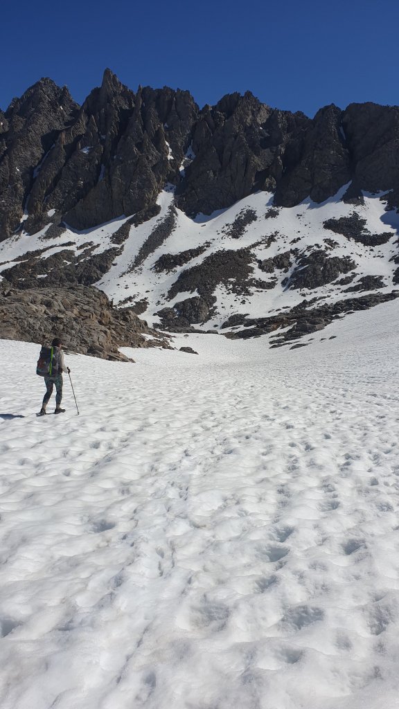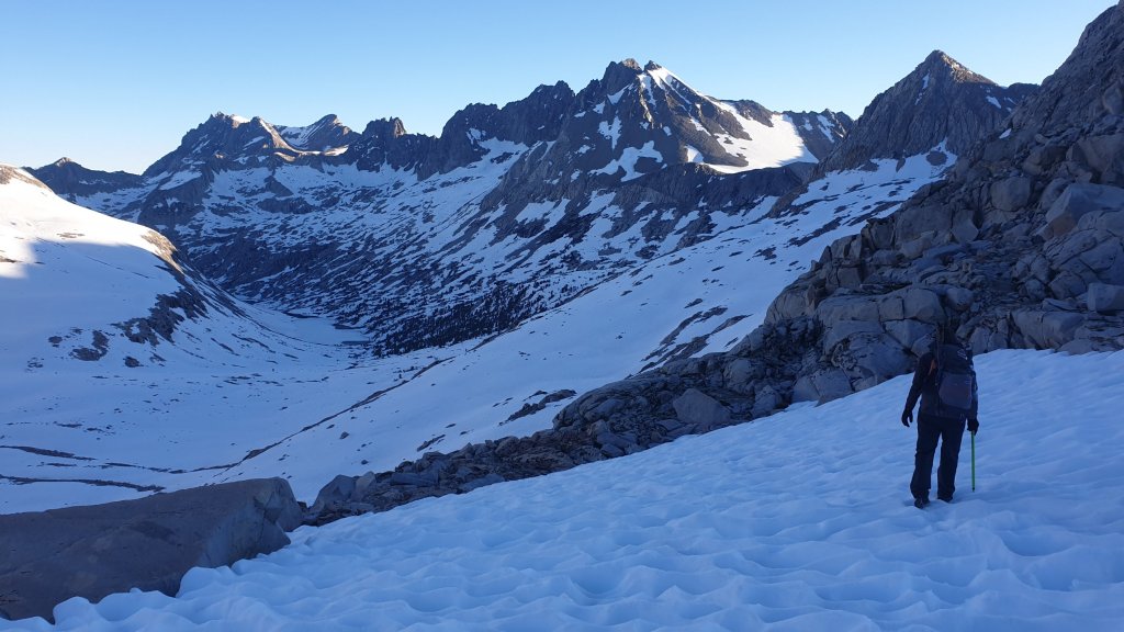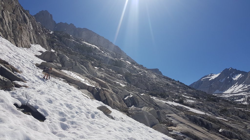 We eventually reached the top of Bishop Pass only to find that the descent was steep. Steeper than we were comfortable with anyway. Luckily, we were able to backtrack to find that most of the switchbacks on the trail were now snow free, so we used them to descend the steepest part of the track before scrambling down the final part of the mixed snow and rock.