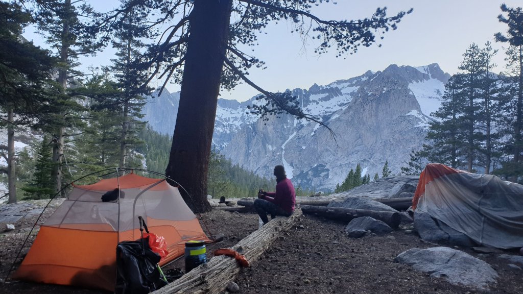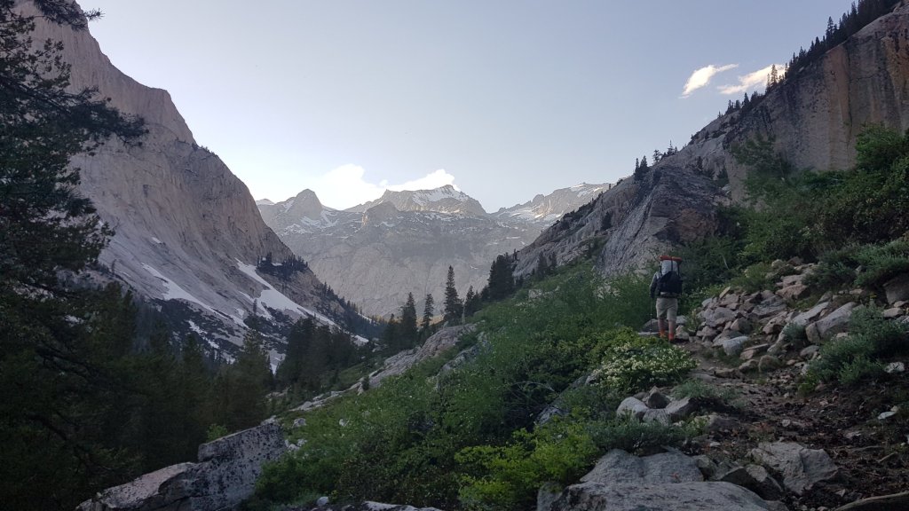 We had dinner on trail before leaving the PCT and climbing up the first set of switchbacks on the Bishop Pass Trail, which would take us in to our first town in 10 days. We had a great view of the stunning Le Conte Canyon from our campsite and will aim to cross Bishop Pass early-ish tomorrow before hitching a ride into Bishop in the afternoon.