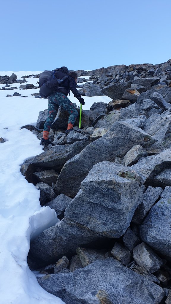 After assessing the options, we decided to rock scramble up the switchbacks again rather than attempting to climb up the snow covered slope.