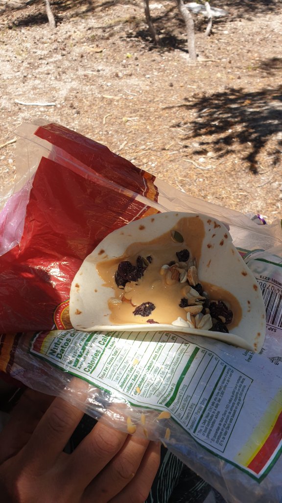 We passed the 900 mile marker and stopped for lunch about 4 miles from Reds Meadow. Leigh decided to get creative and mix liquid peanut butter with trail mix for her wraps.