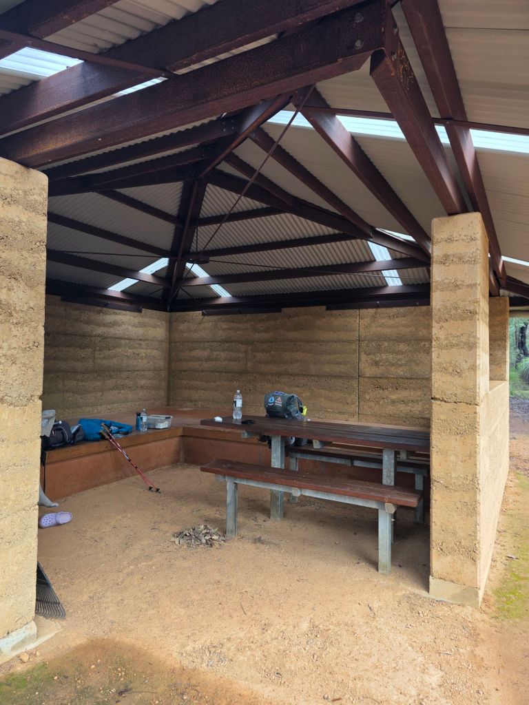 Brookton shelter is a beautiful rammed earth structure set in an open forest, not quite as pretty as my lunch spot at Mt Dale Campsite but a lovely setting. I arrived to find the shelter empty and was just settling in, doing some housekeeping when to my surprise and delight, Jeff appeared around the corner! I was so happy to have the opportunity to enjoy his company for one more night and relieved that I wasn’t going to be spending the evening alone after all.